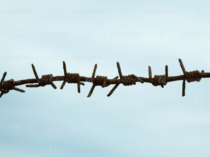 Фрагмент ржавой колючей проволоки на фоне голубого неба