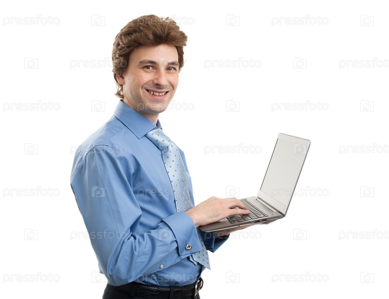 Деловой человек с ноутбуком, изолированный на белом