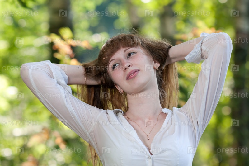 Женщина в белой рубашке на фоне листвы