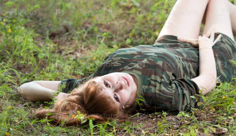 Молодая женщина в футболке цвета хаки лежит на траве