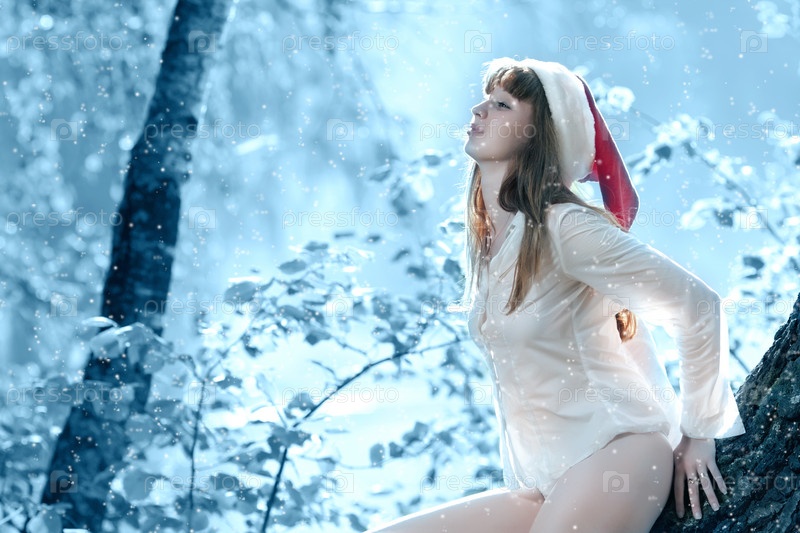 Женщина в белой рубашке и новогодней шапке сидит на дереве
