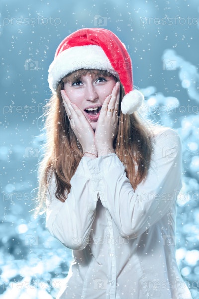 Удивленнгая женщина в новогодней шапке прижимает руки к лицу