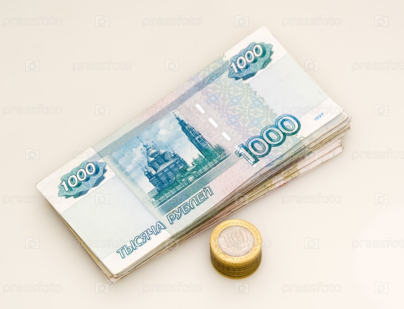 Пачка тысячных банкнот и стопка монет