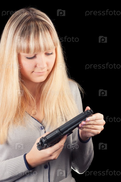Девушка с пистолетом на черном фоне