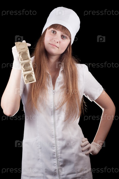 Медсестра в форме держит презервативы на черном фоне