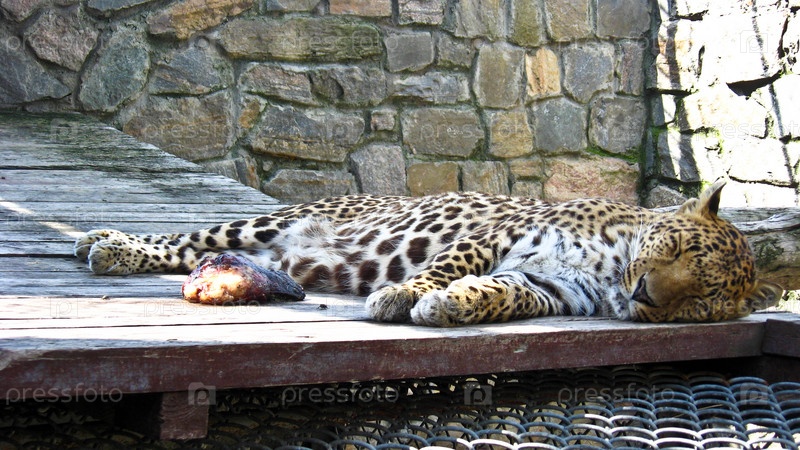 Спящий леопард и кусок мяса возле него