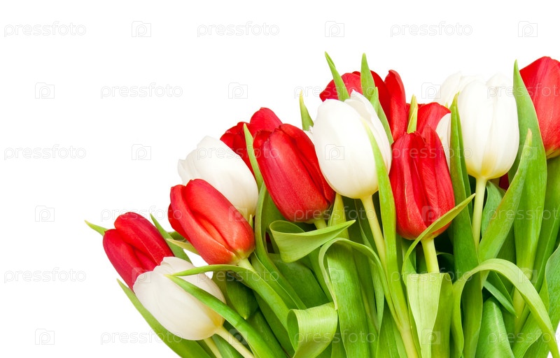 Букет из красных и белых тюльпанов на белом фоне