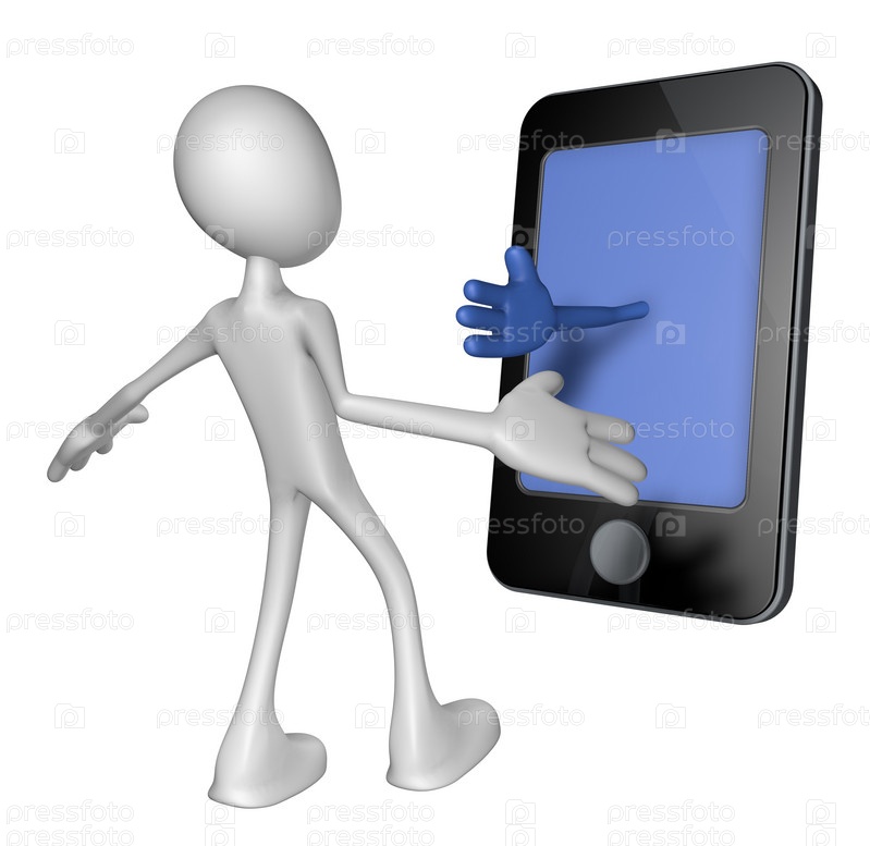 Смартфон с рукой на дисплее и удивленный белый парень - 3D иллюстрация
