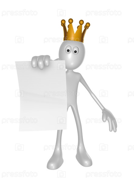 Белый парень с короной держит лист бумаги - иллюстрация 3D