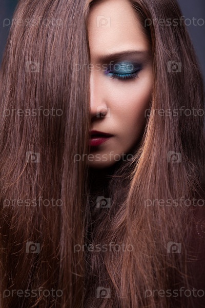 Портрет стильной женщины с длинными каштановыми прямыми волосами