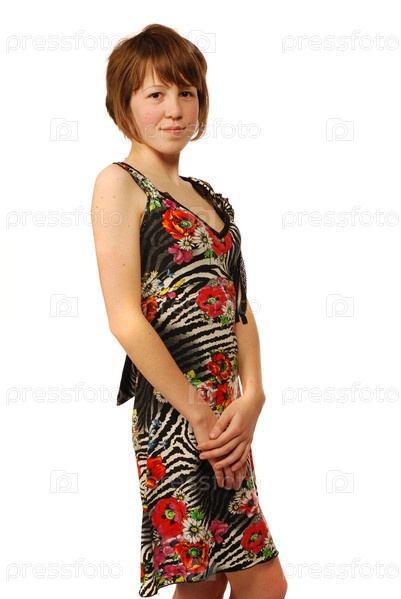 Молодая женщина в легком платье на белом фоне