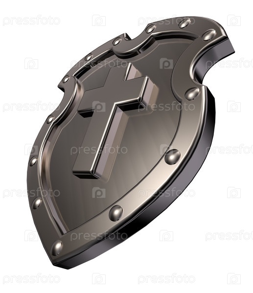 Металлический щит с христианским крестом на белом фоне - 3d иллюстрация
