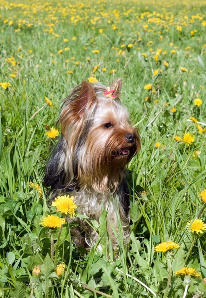 Милый йоркширский терьер среди одуванчиков