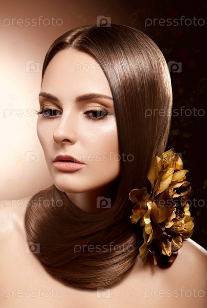 Брюнетка. Красивый макияж, здоровые волосы. Цветок