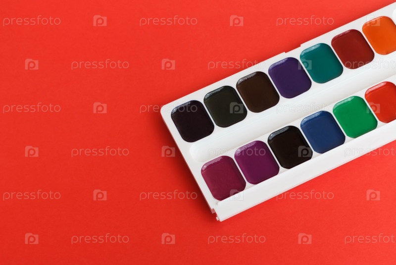 Акварельные краски на красном фоне