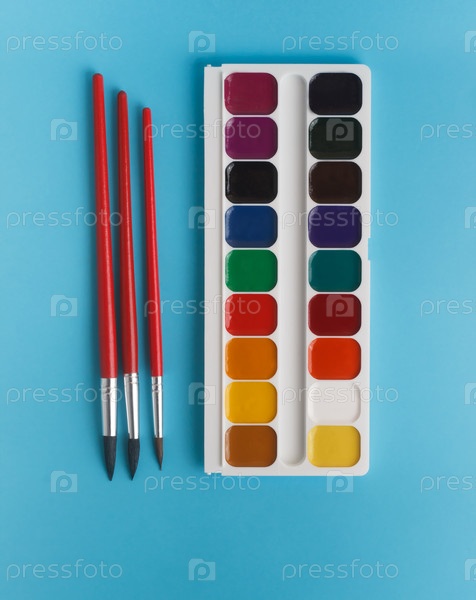 Кисти и акварельные крски на синем фоне