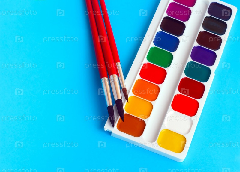 Кисти и акварельные крски на синем фоне