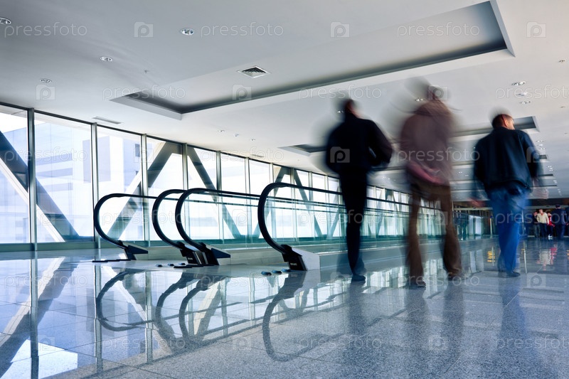 Трое мужчин движутся по серому коридору с эскалаторами в офисном центре