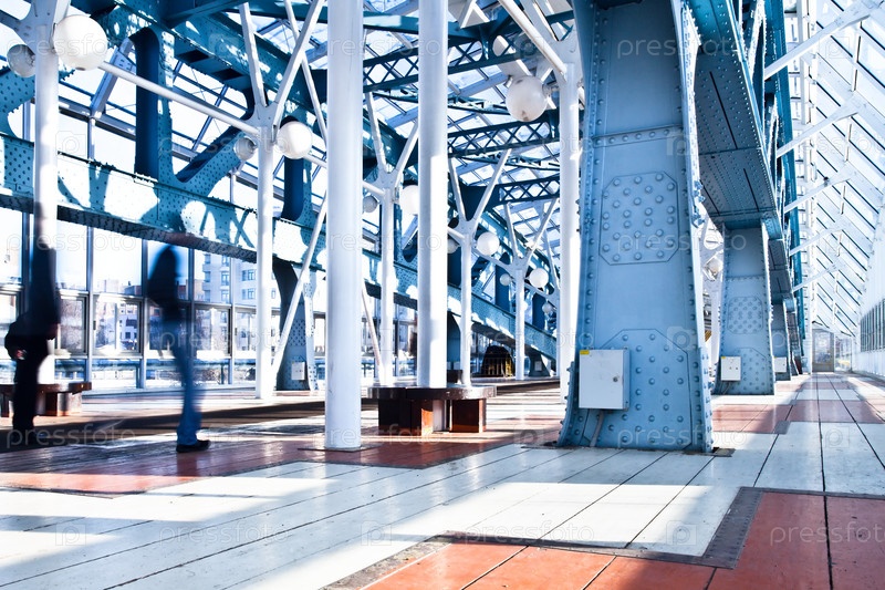 Пешеходный мост с металлическими конструкциями в солнечном свете