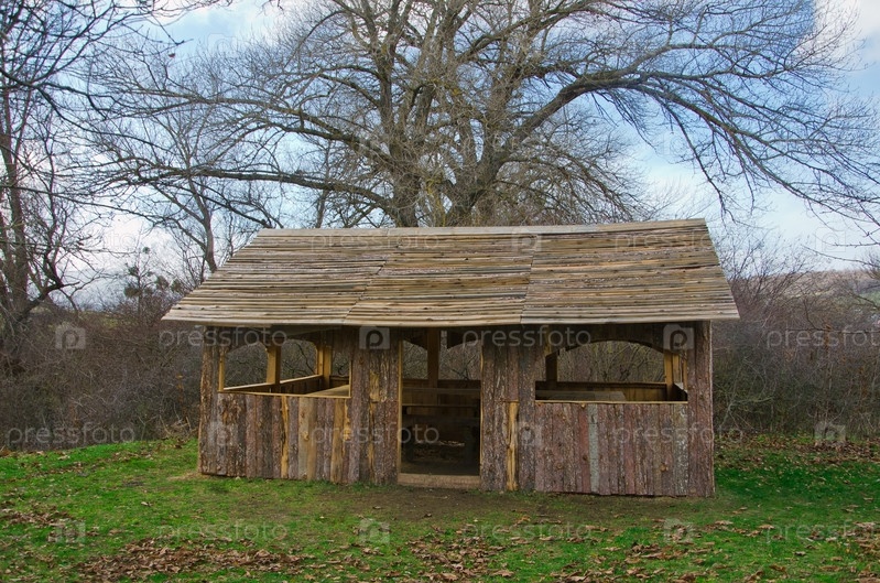 Стол и скамья в деревянной беседке
