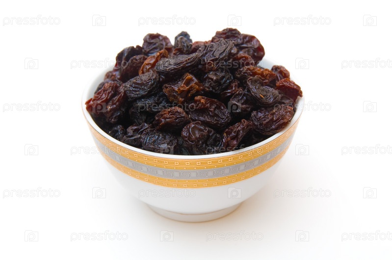 Изюм в чашке на белом фоне