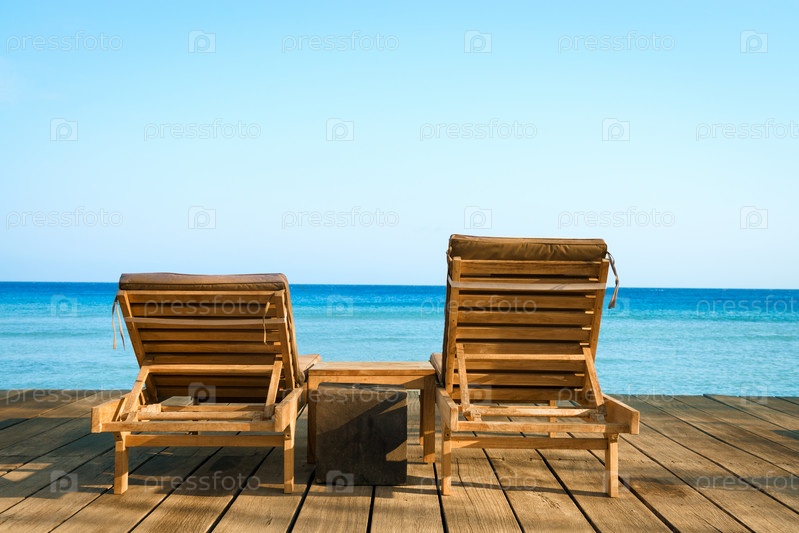 Два деревянных шезлонга, море и чистое небо