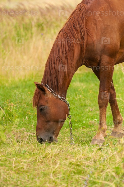 Пасущаяся коричневая лошадь