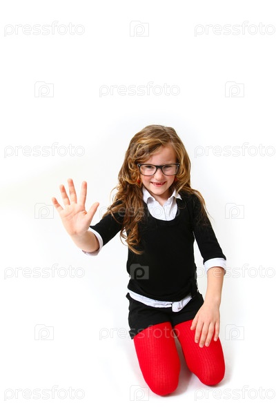 Деловая девочка в очках показывает цифру 5 или "привет", изолированная на белом фоне
