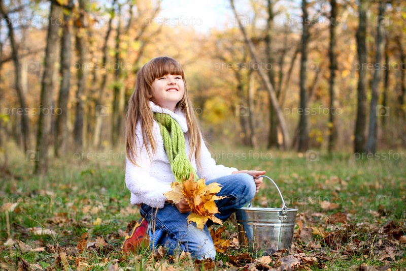 девочка в осеннем лесу с листьями и ведром на открытом воздухе