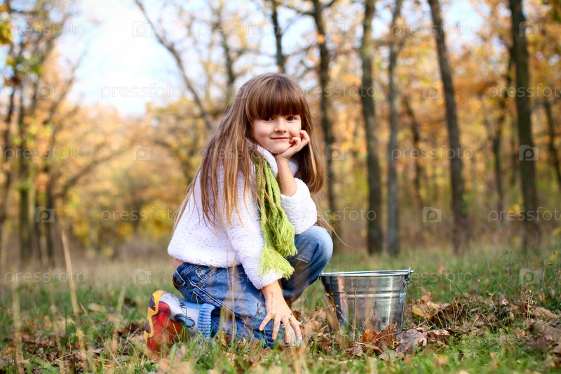Девочка в осеннем лесу с листьями и ведром на открытом воздухе