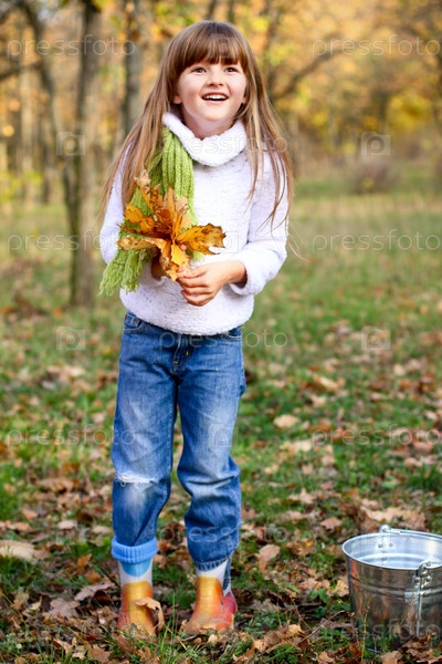 девочка в осеннем лесу с листьями и ведром на открытом воздухе