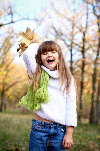 Маленькая девочка держит букет из кленовых листьев на открытом воздухе