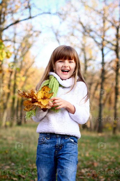 Маленькая девочка держит букет из кленовых листьев на открытом воздухе