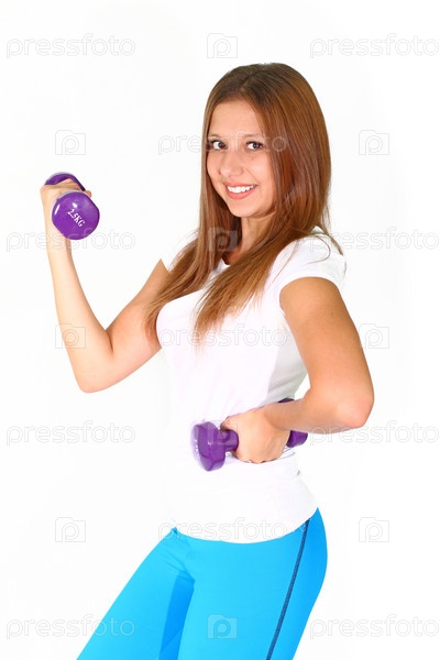 Красивая девушка с гантелями, изолированная на белом фоне