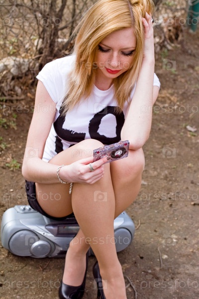 Девушка с кассетой и магнитофоном