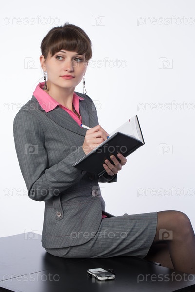 Деловая девушка делает запись в своем блокноте, сидя на столе