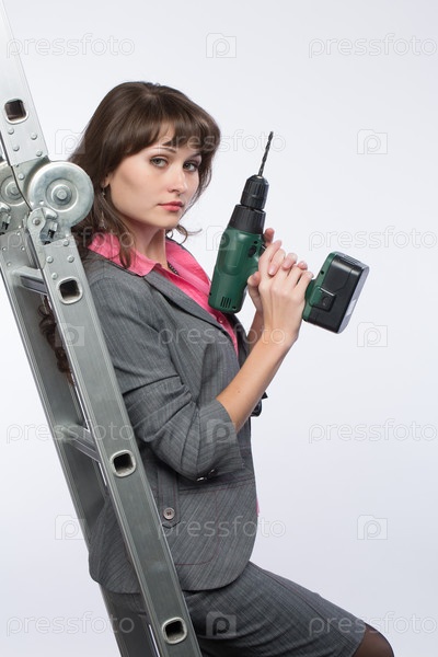 Девушка в деловом костюме с электро-дрелью в руке