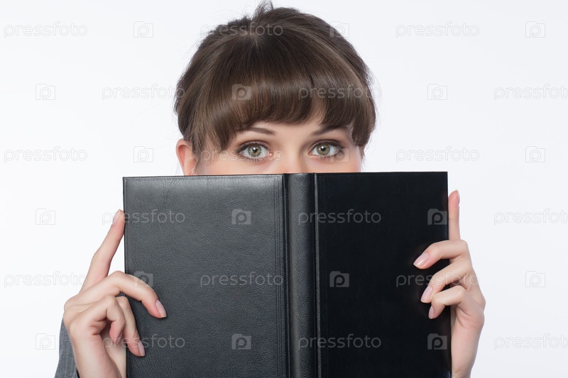 Девушка прикрыла лицо блокнотом