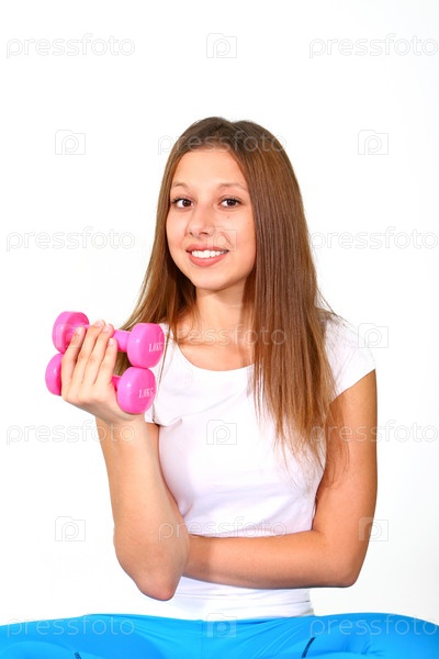 Улябающаяся девушка с гантелями сидит, изолированная на белом фоне