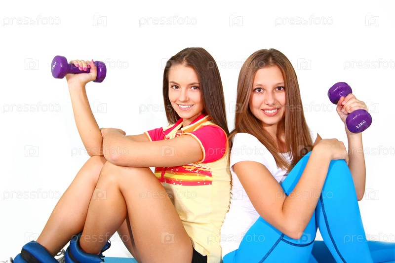 Две улыбающиеся спортивные девушки с гантелями, изолированные на белом фоне
