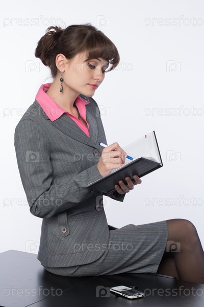 Деловая девушка делает запись в своем блокноте, сидя на столе