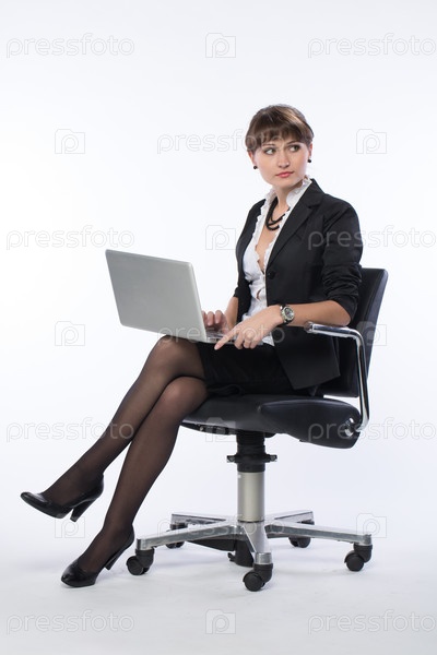 Деловая девушка работает на компьютере, сидя в кресле