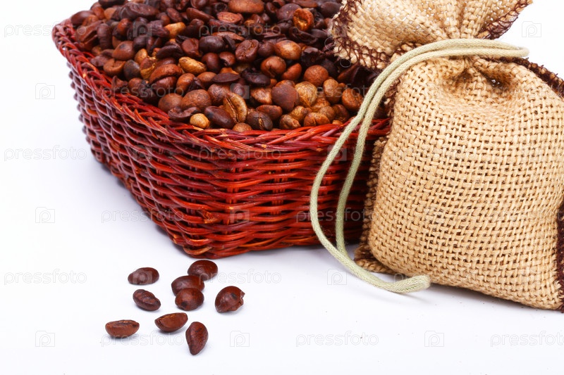 Кофейные зерна в корзинке и мешочке на белом фоне