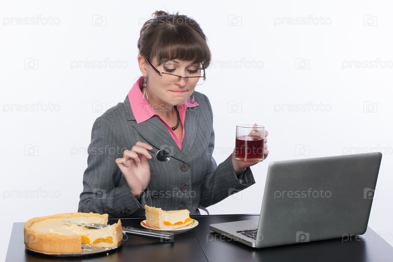 Деловая женщина ест домашний торт на рабочем месте