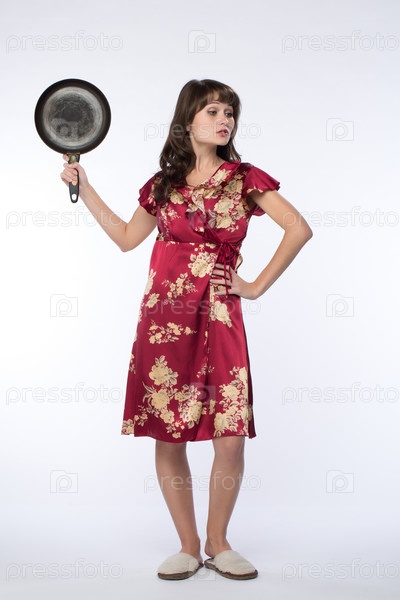 Агрессивная девушка угрожает сковородой