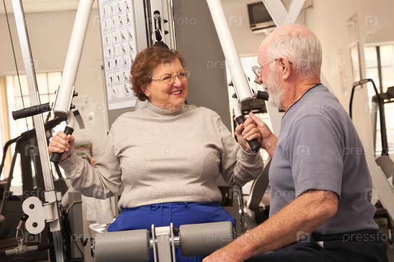 Пожилая пара тренируется в тренажерном зале