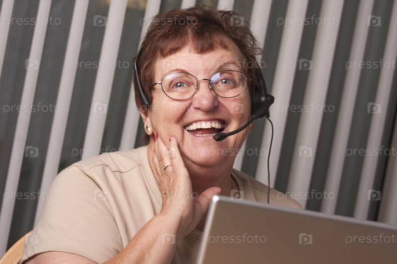 Улыбающаяся пожилая женщина с телефонной гарнитурой перед монитором
