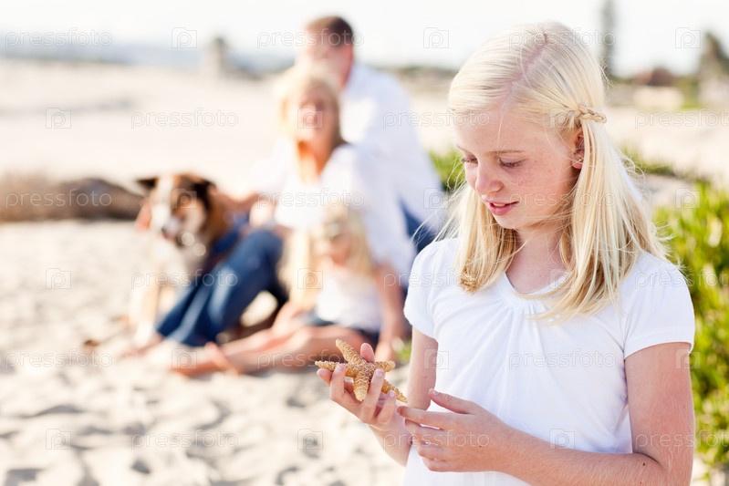 Очаровательная белокурая девочка отдыхает на пляже