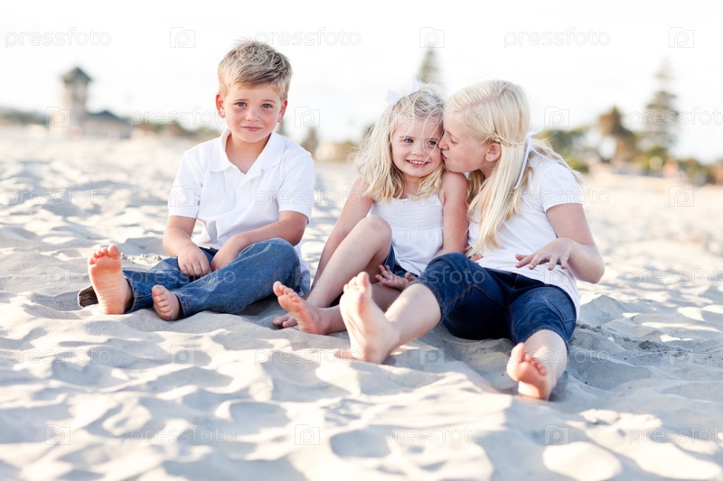 Очаровательные брат и сестры играют на пляже