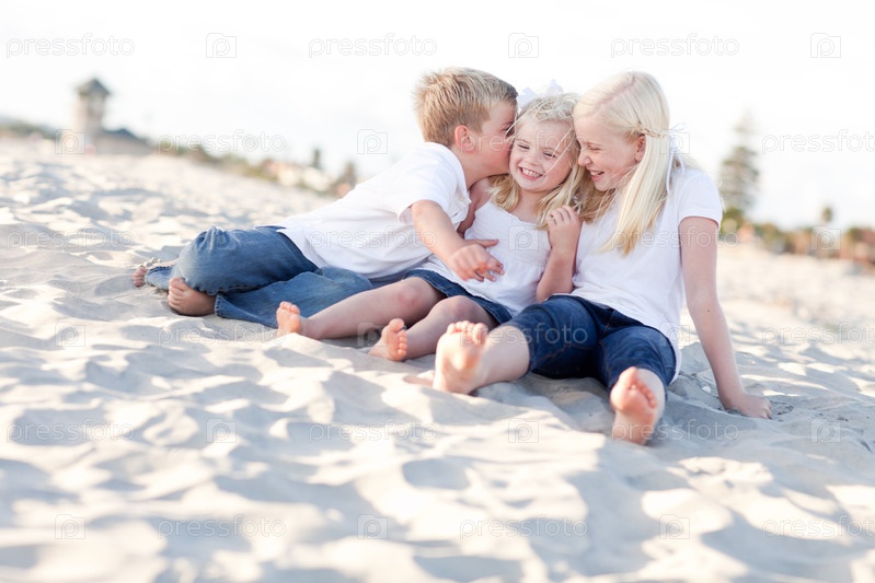 Очаровательные брат и сестры играют на пляже